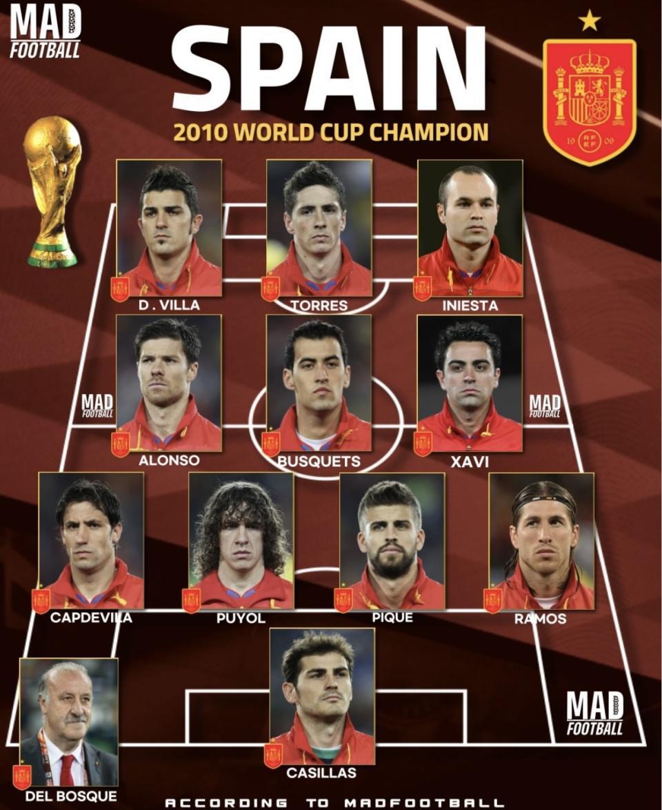 最近一张阵容海报把2010年那支世界杯冠军班底重新放到大家眼前:卡西利亚斯把门,后防是拉莫斯、皮克、普约尔、卡普德维拉;中场由哈维、伊涅斯塔、布斯克茨、阿隆索掌控节奏;锋线是比利亚和托雷斯,场边由博斯克指挥。名单本身就很直观:中轴线厚、经验足,前后场都能兜住局面。