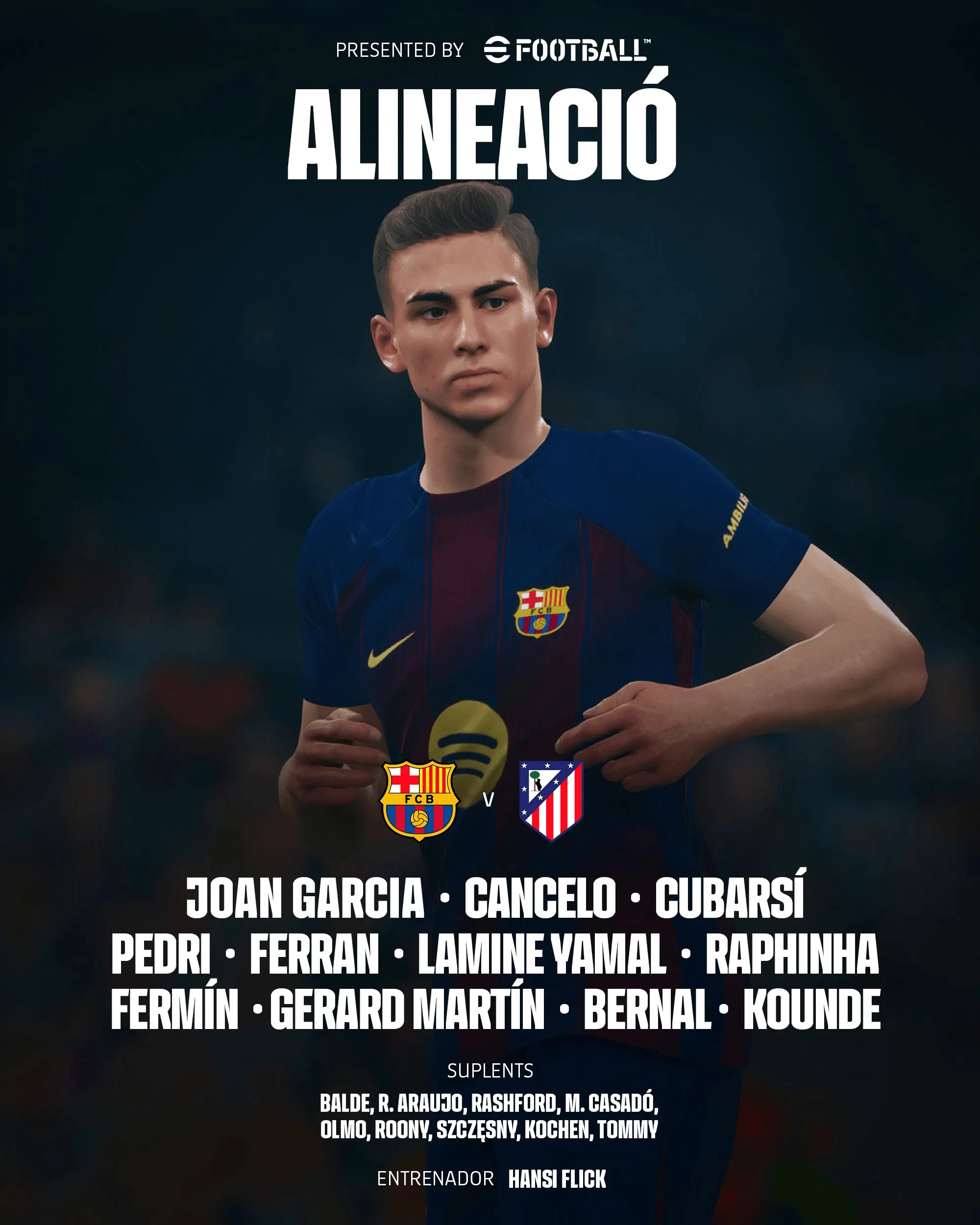 巴塞罗那首发:13-乔安-加西亚、2-坎塞洛、5-库巴西、18-赫拉德-马丁、23-孔德、8-佩德里、22-贝尔纳尔、16-费尔明-洛佩斯、11-拉菲尼亚、7-费兰-托雷斯、10-亚马尔
