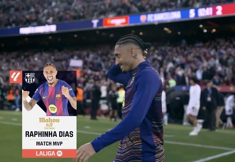 西甲第28轮,巴塞罗那主场5-2击败塞维利亚,此役上演帽子戏法的巴萨前锋拉菲尼亚当选西甲官方全场最佳球员。